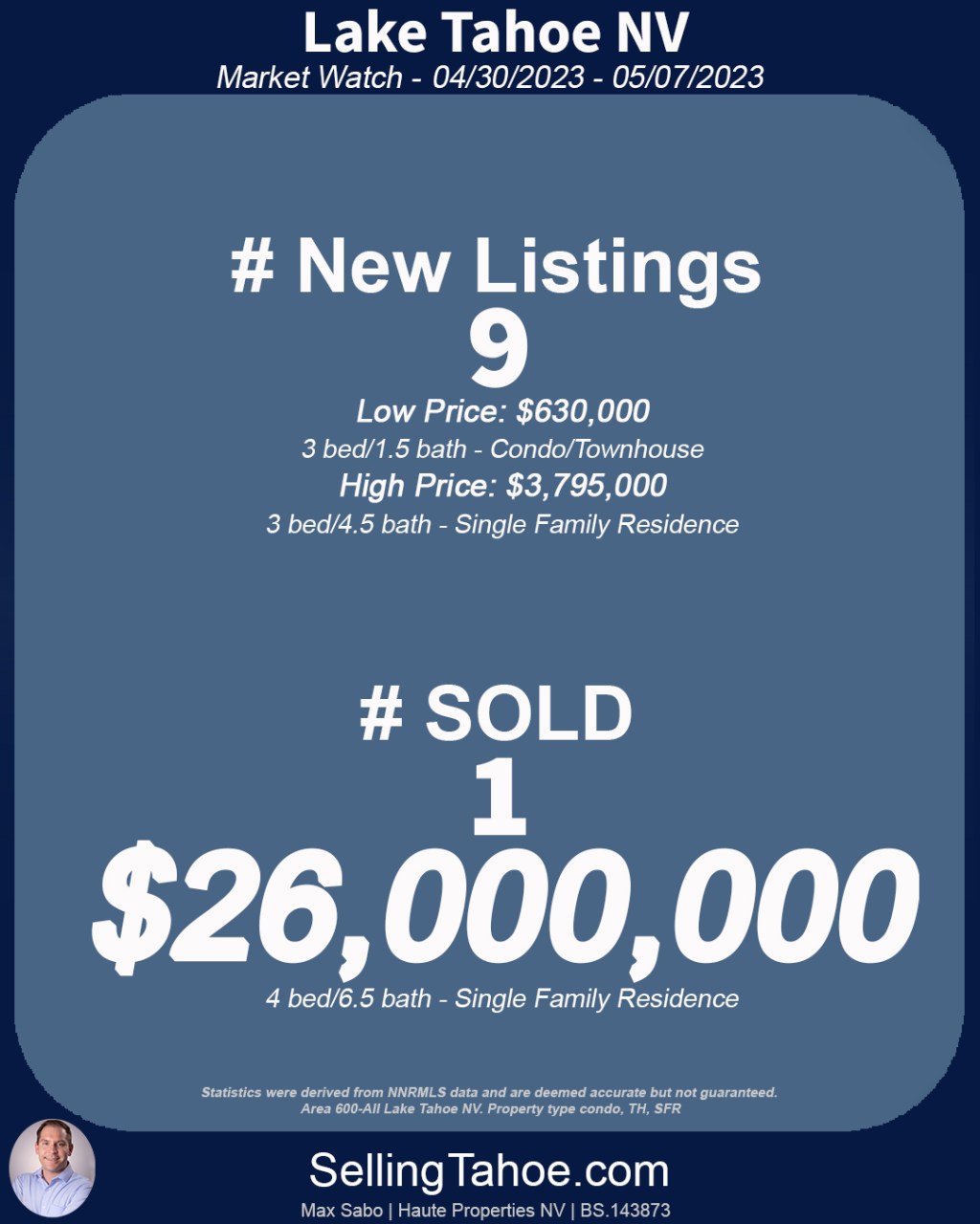 There were 9 new listings and only 1 home sold; but, the home that sold, sold for $26 MILLION!