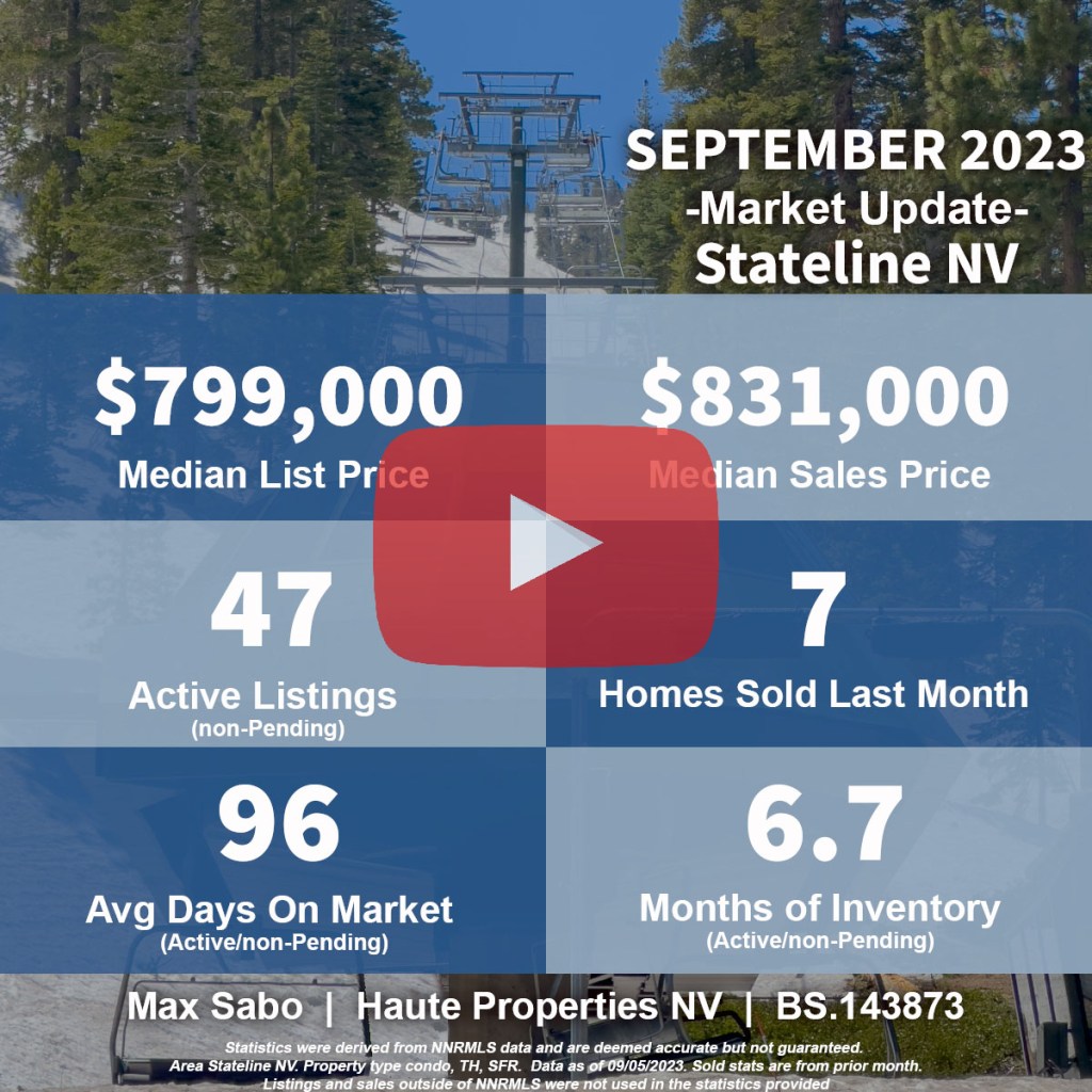 Hi, I’m Max Sabo, your Stateline Nevada Real Estate agent. This is the Real Estate Market Update for September of 2023, covering the sales from August 2023. As the summer season comes to close, we saw the market in Stateline remain consistent. Currently, we have 6.7 months worth of inventory, and last month, 7 homes sold, with a median sales price of $831,000. I’m Max Sabo, your Stateline Nevada Real Estate agent. Please give my video a thumbs up if you liked it, and I’ll see you next month.